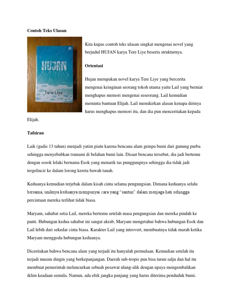 Ada contoh beberapa sinopsis buku untuk guru. Contoh ulasan buku fiksi. Contoh Teks Ulasan Teks ulasan merupakan hasil teks yang berisi tentang review.